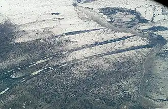 ![]() NASA satellite image showing the straight and parallel ravines of glacial origin | |