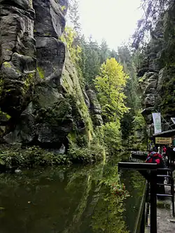 The Obere Schleuse in Hinterhermsdorf is a barrage system on the German-Czech border river of Kirnitzsch and impounds the water over a length of 700 metres. It was originally a facility for timber rafting. There are boat rides on the reservoir today during the summer months. At the boat landing point the water depth is 1 metre; by the dam it is 4 metres. The water temperature rarely climbs above 8 °C in summer. In the winter months, when there are no boat trips, the water is not impounded and the Kirnitzsch flows in its original river bed.
