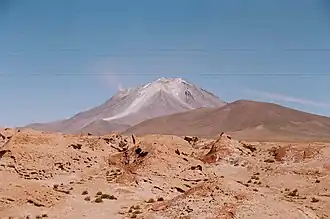 A major fumarole is active on the summit of the volcano, its plume reaching heights of 100 metres (330 ft).[51] It is strong enough that it can be seen on the ground from over 10 kilometres (6.2 mi) away.[86] The vent of the fumarole lies in the summit lava domes,[51] more specifically in a 200 metres (660 ft) high and 350 metres (1,150 ft) wide collapse scar in the southeasternmost lava dome of the compound summit lava dome.[35] Other volcanoes in the area with fumarolic activity include San Pedro and Putana.[87]