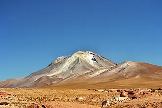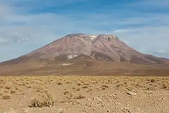 Ollagüe (Spanish pronunciation: [oˈʎaɣwe]) or Ullawi (Aymara: [uˈʎawi]) is a massive andesite stratovolcano in the Andes on the Bolivia–Chile border, within the Antofagasta Region of Chile and the Potosi Department of Bolivia. Part of the Central Volcanic Zone of the Andes, its highest summit is 5,868 metres (19,252 ft) above sea level and features a summit crater that opens to the south. The western rim of the summit crater is formed by a compound of lava domes, the youngest of which features a vigorous fumarole that is visible from afar.