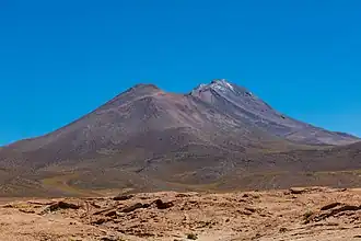 Ollagüe straddles the border between Chile and Bolivia, with most of the edifice lying on the Bolivian side.[9] The Chilean portion lies in the commune of Ollague, in the El Loa province of the Antofagasta Region,[10] while the Bolivian segment lies in the Potosi department.[11] Towns and human sites close to Ollagüe are Amincha,[10] Buenaventura,[12] Cosca, El Chaco, Ollague[13] and Santa Rosa,[14] and the main road of Ollagüe runs along the western foot of the volcano.[12] The first documented ascent was in 1888.[15] The mountain reportedly can be climbed from the eastern side.[16] The occurrence of warning signs about minefields has been reported.[17]