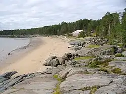 The Onega Bay (Russian: Онежская губа, Онежский залив) is located in the Republic of Karelia and Arkhangelsk Oblast in Northwestern Russia, west of the city of Arkhangelsk. It is the southernmost of four large bays and gulfs of the White Sea, the others being the Dvina Bay, the Mezen Bay, and the Kandalaksha Gulf. The area of the bay is 6,630 square kilometres (2,560 sq mi). The Onega Bay is 185 kilometres (115 mi) long and 50 kilometres (31 mi)-100 kilometres (62 mi) wide. The average depth of the bay is 16 metres (52 ft), and the maximum depth is 36 metres (118 ft). The bay freezes in winter.[2]