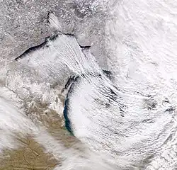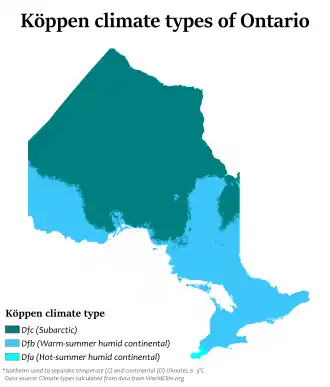 Ontario's climate varies by season and location.[19] Three air sources affect it: cold, dry, arctic air from the north (dominant factor during the winter months, and for a longer part of the year in far northern Ontario); Pacific polar air crossing in from the western Canadian Prairies/US Northern Plains; and warm, moist air from the Gulf of Mexico and the Atlantic Ocean.[20] The effects of these major air masses on temperature and precipitation depend mainly on latitude, proximity to major bodies of water and to a small extent, terrain relief.[20] In general, most of Ontario's climate is classified as humid continental.[20]