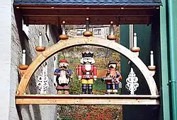 The Ore Mountains are nationally known for their variety of customs at Advent and Christmas time. This is epitomized by traditional Ore Mountain folk art, in the form of smoking figures, Christmas pyramids, candle arches, nutcrackers, miners' and angels' figures, all of which are used as Christmas decorations. Above all, places in the Upper Ore Mountains decorate their windows during the Christmas season in such a way that they are transformed into a "sea of light". In addition, traditional Christmas mining celebrations such as the Mettenschicht and Hutzenabende draw many visitors and have made the Ore Mountains known as "Christmasland" (Weihnachtsland).
