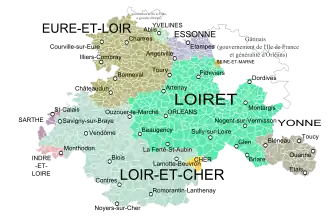 In 1791, under the auspicious of 'unity of France', the provinces were dissolved and succeeded by smaller départments. The former province was split between several new départments: Loiret, Loir-et-Cher, Eure-et-Loir, Seine-et-Oise, and Yonne.[4][5][6][7][8][9][11]