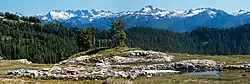 The Pacific Northwest is a diverse geographic region, dominated by several mountain ranges, including the Coast Mountains, the Cascade Range, the Olympic Mountains, the Columbia Mountains, and the Rocky Mountains. The highest peak in the Pacific Northwest is Mount Rainier, in the Washington Cascades, at 14,410 feet (4,392 m). Immediately inland from the Cascade Range are broad, generally dry plateaus. In the US, this region is known as the Columbia Plateau, while in British Columbia, it is the Interior Plateau, also called the Fraser Plateau. The Columbia Plateau was the scene of massive ice-age floods, and as a consequence, there are many coulees, canyons, and the Channeled Scablands. Much of the plateau, especially in eastern Washington, is irrigated farmland.[40] The Columbia River cuts a deep and wide gorge around the rim of the Columbia Plateau and through the Cascade Range on its way to the Pacific Ocean.