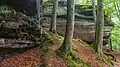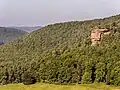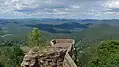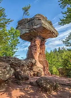 The Palatinate Forest Nature Park (German: Naturpark Pfälzerwald) lies in the south of Rhineland-Palatinate in Germany and borders on France. The nature park covers an area of 177,100 hectares (684 sq mi) and some 76% of its area is under the woods of the Palatinate Forest, the largest contiguous forest region in Germany. Together with parts of northern Alsace and Lorraine, it forms the Palatinate Forest-North Vosges Biosphere Reserve and has an impressive Bunter sandstone landscape.