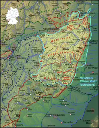 ![]() Blue: Palatinate Forest Nature Park (Germany) Red: The entire Palatinate Forest in both Germany and France | |