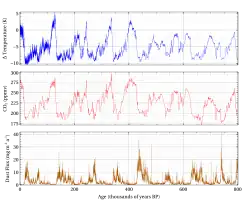 - ^ Jouzel, J.; Masson-Delmotte, V.; Cattani, O.; Dreyfus, G.; Falourd, S.; Hoffmann, G.; Minster, B.; Nouet, J.; Barnola, J. M. (10 August 2007). "Orbital and Millennial Antarctic Climate Variability over the Past 800,000 Years" (PDF). Science. 317 (5839): 793–796. Bibcode:2007Sci...317..793J. doi:10.1126/science.1141038. ISSN 0036-8075. PMID 17615306. S2CID 30125808.