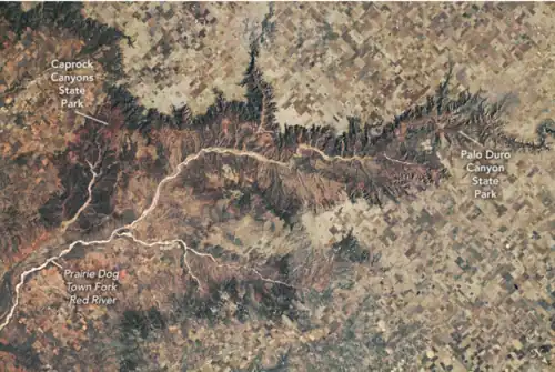The canyon was formed by the Prairie Dog Town Fork Red River, which initially winds along the level surface of the Llano Estacado of West Texas, then suddenly and dramatically runs off the Caprock Escarpment. Water erosion over the millennia has shaped the canyon's geological formations.