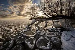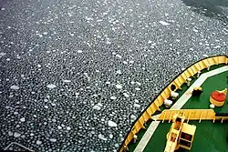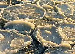 Pancake ice is a form of sea ice that consists of round pieces of ice with diameters ranging from 30 centimetres (12 in) to 3 metres (9.8 ft) and thicknesses up to 10 centimetres (3.9 inches), depending on the local conditions. It forms as a result of wave action on slush or ice rind.[1]