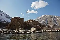 The Panjshir Valley (Dari: درهٔ پنجشير, Dara-i-Panjsher, literally "Valley of the Five Lions"), also spelled Panjsher, is a valley in northeastern Afghanistan, 150 kilometres (93 mi) north of Kabul, near the Hindu Kush mountain range.[1] It is divided by the Panjshir River. The valley is home to more than 100,000 people, including Afghanistan's largest concentration of ethnic Tajiks as of 1997.[2] In April 2004, it became the heart of the new Panjshir Province, having previously been part of Parwan Province.[3] Politically, this province has been considered the start point of Afghanistan's Jihad period against the Soviets. This province is also the birthplace of Afghanistan's national hero, Ahmad Shah Massoud.[4]