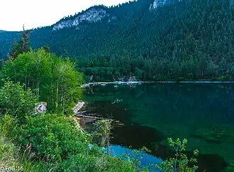 The lake demonstrates karst hydrology, with underground inflows from Marble Canyon creeks.[1] The lake has generally low biological productivity, and is classified as ultraoligotrophic. It also features a high degree of water clarity.[1] The lake gets covered with ice annually, and is dimictic, going through two thermal overturns per year.[1] The lake reaches a maximum depth of 65 meters below the surface.[2] It is also a hard water lake, due to its high mineral content.[1]