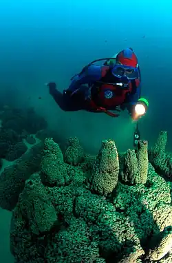 Part of a karst formation, the lake is most notable for being home to colonies of microbialites,[1] a type of stromatolite. Colonies of microbialites grow from depths of 5 to 55 meters. Low sedimentation rates may allow for continued development of these colonies.[1] One estimate puts microbialite growth at 0.05 mm per year within the last 1,000 years.[3] Research at Pavilion Lake has suggested that most biological activity in microbialite structures occurs near the surface of these structures.[3] The lake's harsh geochemical environment prevents the development of metazoan grazers, also allowing for microbialite development.[1]