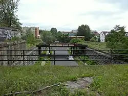 The complex was built on the northern portion of landfilled Harsimus Cove. The southern part was the Pennsylvania Railroad abattoir and freight yard. A narrow slip kept that name, while another called the Long Slip was created and separated it from Hoboken Terminal. The only visible trace of the Erie's waterfront complex that remains today is part of the right of way/viaduct which carried trains from the foot of the Palisades escarpment to the waterfront. Part of it runs parallel to Boyle Plaza (the toll plaza for the Holland Tunnel) and is used for motor vehicular traffic to the Newport district of Jersey City.[27]