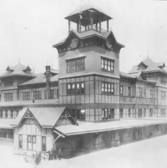 The Erie began developing the waterfront site in 1856.[3] The intermodal complex was open December 4, 1887.[4] Across the river-facing facade was New York, Lake Erie and Western Railroad, the name of the entity that built it, though it was also called Jersey City Terminal Station[5] or Erie Railroad Station The colloquial name is taken from the 17th century European settlement of Pavonia, New Netherland,[6] which began in the area and the ferry that served it. It has been described as "a brightly colored Victorian eclectic three story terminal located at the foot of Pavonia Avenue to serve a twelve track" station. It was designed by George E. Archer.[7] The end of track was at about 40.7266 N 74.0304 W. Besides the railroad, the complex was served by ferries, streetcars and the rapid transit Hudson and Manhattan Railroad (now PATH). The terminal was also used by New York, Susquehanna and Western Railway trains.[8] Long distance and suburban passenger trains reached the terminal by travelling through Bergen Hill via the Long Dock Tunnel and later under the Bergen Arches.[9]