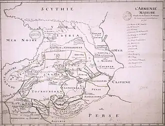 The region was known to Greco-Roman authors as Caspiane, which was once home to a people called the Caspians.[2] Caspiane was contested between the regional powers. Strabo, writing c. 20 AD, mentions Caspiane among the lands conquered by King Artaxias I of Armenia from the Medes in the 2nd century BC, but adds that this land belonged to "the country of the Albanians" in his time.[8][9] Armenia had lost the territory to Caucasian Albania in about 59 BC, when Pompey rearranged the political geography of the region after defeating Tigranes the Great.[10] The region was again conquered by the Armenians at some point, most likely during the reign of Vologases I of Armenia.[4][11]