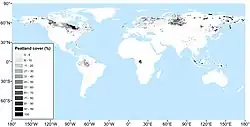 Peatlands are found around the globe, although are at their greatest extent at high latitudes in the Northern Hemisphere. Peatlands are estimated to cover around 3% of the globe's surface,[6] although estimating the extent of their cover worldwide is difficult due to the varying accuracy and methodologies of land surveys from many countries.[2] Mires occur wherever conditions are right for peat accumulation: largely where organic matter is constantly waterlogged. Hence the distribution of mires is dependent on topography, climate, parent material, biota and time.[10] The type of mire—bog, fen, marsh or swamp—depends also on each of these factors.