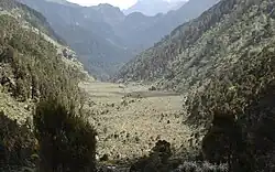 A valley mire creates a level ground surface in otherwise dramatic topography. Upper Bigo Bog, Rwenzori Mountains, Uganda.