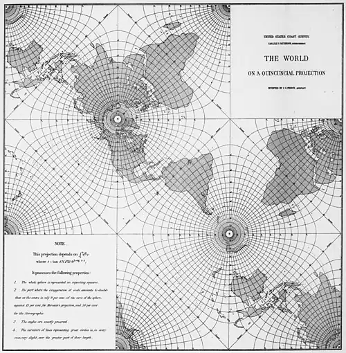 The maturation of complex analysis led to general techniques for conformal mapping, where points of a flat surface are handled as numbers on the complex plane. While working at the United States Coast and Geodetic Survey, the American philosopher Charles Sanders Peirce published his projection in 1879,[2] having been inspired by H. A. Schwarz's 1869 conformal transformation of a circle onto a polygon of n sides (known as the Schwarz–Christoffel mapping). In the normal aspect, Peirce's projection presents the Northern Hemisphere in a square; the Southern Hemisphere is split into four isosceles triangles symmetrically surrounding the first one, akin to star-like projections. In effect, the whole map is a square, inspiring Peirce to call his projection quincuncial, after the arrangement of five items in a quincunx.