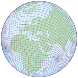The Peirce quincuncial projection is "formed by transforming the stereographic projection with a pole at infinity, by means of an elliptic function".[5] The Peirce quincuncial is really a projection of the hemisphere, but its tessellation properties (see below) permit its use for the entire sphere. The projection maps the interior of a circle onto the interior of a square by means of the Schwarz–Christoffel mapping, as follows:[4]