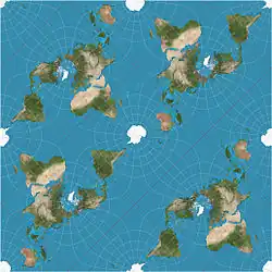 The Peirce quincuncial projection is the conformal map projection from the sphere to an unfolded square dihedron, developed by Charles Sanders Peirce in 1879.[1] Each octant projects onto an isosceles right triangle, and these are arranged into a square. The name quincuncial refers to this arrangement: the north pole at the center and quarters of the south pole in the corners form a quincunx pattern like the pips on the five face of a traditional die. The projection has the distinctive property that it forms a seamless square tiling of the plane, conformal except at four singular points along the equator.