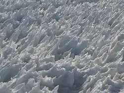 Penitentes, or nieves penitentes (Spanish for "penitent snows"), are snow formations found at high altitudes. They take the form of elongated, thin blades of hardened snow or ice, closely spaced and pointing towards the general direction of the sun.[1]