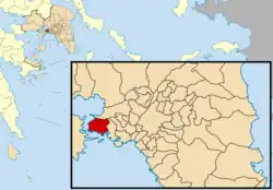 Perama (Greek: Πέραμα) is a coastal town and a suburb of Piraeus and belongs to the Piraeus regional unit and is the southwestern limit of Athens urban area.[3][4] It lies on the southwest edge of the Aegaleo mountains, on the Saronic Gulf coast. It is 8 km northwest of Piraeus, and 14 km west of the center of Athens. The municipality has an area of 14.729 km2.[5] It forms the western terminus of the Port of Piraeus, and there is also a passenger port that provides ferry services to Salamis Island.[6]