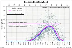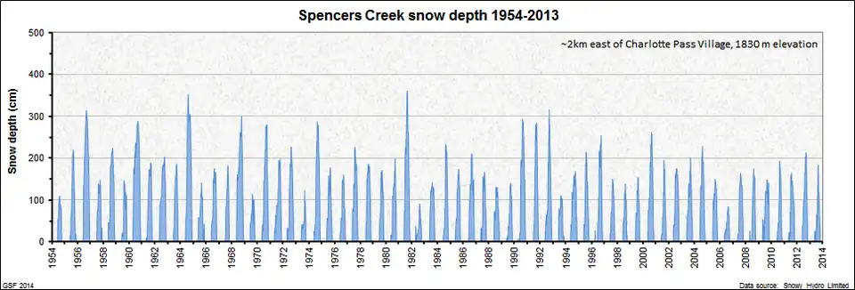 Snow depth measurements are taken by Snowy Hydro at Spencers Creek, approximately 2 kilometres (1 mi) west of Perisher Valley.