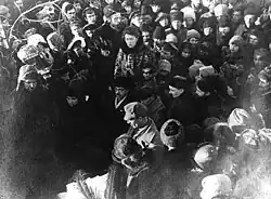 Kropotkin died of pneumonia on 8 February 1921.[50] His family refused an offer of a state funeral.[53] With his Moscow funeral, the Bolsheviks permitted the diminished Russian anarchist movement an official, restrained occasion to memorialize their figurehead.[30] It was the last major anarchist demonstration of the period in Russia, because the movement and Kropotkin's writings were fully suppressed later that year.[53]