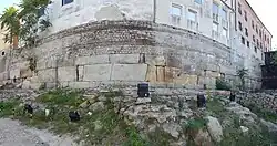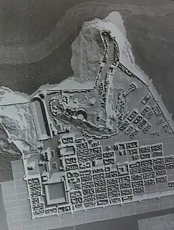 The Hippodamian street plan was applied to Philippopolis as in other ancient towns like Miletus, Ephesus, Alexandria and Olynthus.[36][37] Hellenistic Philippopolis had a network of orthogonal gravel streets. Some of the streets had pavements, curbs and cambers to accommodate rain water drainage. The intersecting streets formed rectangular city blocks (insulae) with residential and public buildings.[36] A great number of public buildings were built such as theatre, agora, and temples.