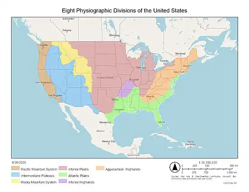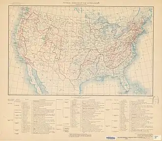 The physiographic regions of the contiguous United States comprise 8 divisions, 25 provinces, and 85 sections.[1] The system dates to Nevin Fenneman's report Physiographic Divisions of the United States, published in 1916.[2][3] The map was updated and republished by the Association of American Geographers in 1928.[4] The map was adopted by the United States Geological Survey by publication in 1946.[5]