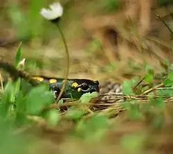 The national park is one of three areas in Greece that hosts a population of Eurasian brown bears (Ursus arctos arctos),[11] which is considered a conservation priority species.[12] The region itself is also called "bear park".[13] Other large mammals that live in the park are lynxes, roe deers and wildcats,[6] with the last two being found in the area of Flegga forest.[14] Additionally wolves, beech martens, wild boars and red squirrels are present in the area all year round.[15] On the other hand, the Balkan chamois (Rupicapra rupicapra balcanica), a Balkan endemic species, is found on the steep and rocky parts of the park, as well as in areas with beech forests. Its population density fluctuates between 3-5 and even 20 individuals per 100 ha (250 acres) depending on the habitat productivity.[16] The three small rivers crossing the area of the park have very clear water and are the well conserved habitat of the otter.[16]