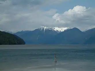 Pitt Lake is the second-largest lake in the Lower Mainland of British Columbia. About 53.5 km2 (20.7 sq mi) in area, it is about 25 km (16 mi) long and about 4.5 km (2.8 mi) wide at its widest. It is one of the world's relatively few tidal lakes, and among the largest. In Pitt Lake, there is on average a three-foot tide range; thus Pitt Lake is separated from sea level and tidal waters during most hours of each day during the 15 foot tide cycle of the Pitt River and Strait of Georgia estuary immediately downstream.[3] The lake's southern tip is 20 km (12 mi) upstream from The Pitt River confluence with the Fraser River and is 40 km (25 mi) east of Downtown Vancouver.