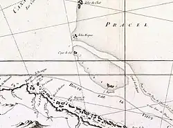 The term appears in Spanish nautical charts as placer, although Pedro Sarmiento de Gamboa writes it as placel. The Portuguese language equivalent and derived term is pracel or parcel.[2] In present times some of the geographical names used by the Spanish cartographers, such as Placer de los Colorados, Placer de los Estudios, Placer de Playa Grande, Placer de Montechristi, Placer de Quatro Cayos, Placer de la Gallega, Placer de las Tortugas and Placer de los Siete Hermanos have become obsolete or have been superseded by English terms. Still, many other placeres mentioned in 19th-century Spanish Navigation Instruction Manuals were not even named.[3] Not all placeres are in the open sea; the Isla Cangrejos in the Orinoco Delta was described as having a placer that stretched from its NE point composed of ground-coffee coloured hard sand.[4]