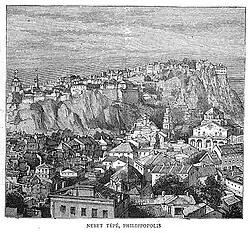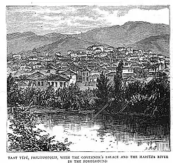According to the Latin historian of the Fourth Crusade, Geoffrey of Villehardouin, Philippopolis was the third largest city in the Byzantine Empire, after Constantinople (Istanbul) and Thessalonica (Thessaloniki).[6] It suffered damage from the armies passing through the city during the Crusades as well as from sectarian violence between the Eastern Orthodox and the Armenian Orthodox and Paulician denominations.[6] The city was destroyed by Kaloyan of Bulgaria (r. 1196–1207) in 1206 and rebuilt thereafter.[6] In 1219, the city became the capital of the Crusader Duchy of Philippopolis, part of the Latin Empire.[6] The Second Bulgarian Empire recovered the city in 1263, but lost it to Byzantine control before recapturing it in 1323.[6] The Ottoman Empire conquered Philippopolis (Turkish: Filibe) in 1363 or 1364.[6] During the 500 years of Ottoman rule, Filibe served as one of the important commercial and transportation nodes in the Ottoman Balkans. It also played a role as an administrative centre of various sanjaks and eyalets.