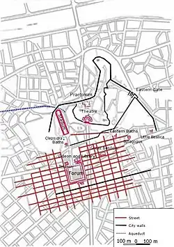 In Late Antiquity, Philippopolis was an important stronghold, but was sacked in 250 during the Crisis of the Third Century,[5] after the Siege of Philippopolis by the Goths led by Cniva. After this the settlement contracted, though it remained a major city, with the city walls rebuilt and new Christian basilicas and Roman baths constructed in the 4th century.[6][7] The city was again sacked by the Huns in 441/442, and the walls were again rebuilt.[7] Roman Philippopolis resisted another attack, by the Avars in the 580s, after the walls were renewed yet again by Justinian the Great (r. 527–565).[7]