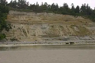 Beneath Point Roberts, the bedrock of the Chuckanut Formation was deposited as an alluvial plain containing layers of sediments consisting of silt, sand, gravel and peat. During the last 60 million years the sediments were compacted and folded by mountain building forces from continental drift to form strata of siltstone, sandstone, conglomerate and coal. During recent geologic history, the Chuckanut formation was overridden by four or more glaciations.[28]