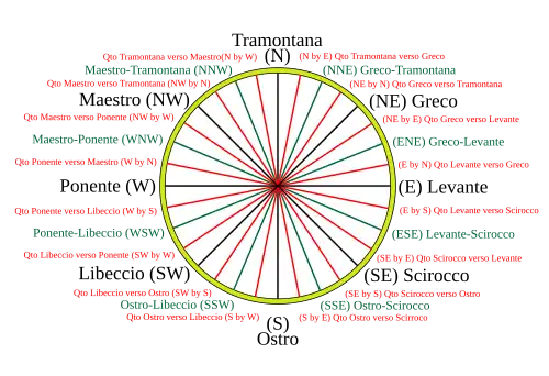 | 1 | North by east | NbE | Quarto di Tramontana verso Greco | 5+5/8° | 11+1/4° | 16+7/8° |