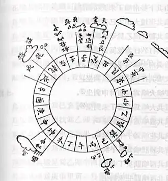 Headings mid-way in-between are compounds as in English. For instance, 癸子 refers to the direction halfway between point 子 and point 癸, or 7+1⁄2°. This technique is referred to as a double-needle (雙針) compass.