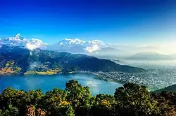 Pokhara is located 200 kilometres (120 miles) west of the capital, Kathmandu, on the shore of Phewa Lake, and sits at an average elevation of approximately 822 m above sea level.[5] The Annapurna Range, with three out of the ten highest peaks in the world—Dhaulagiri, Annapurna I and Manaslu—is within 15–35 mi (24–56 km) aerial range from the valley.[6][7]