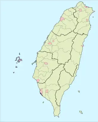 1. ^ Davidson (1903), pp. 597–8: "In place of the former system, which divided the island into 3 prefectures and 3 prefectures of second class, and which was abolished November 11th, 1901, local administrative offices known as "Cho" have been established at the following points: Taihoku, Kelung, Giran (Gilan), Shinko (Chim-hua), Toshien (Tao-hong), Shinchiku (Teck-cham), Bioritsu (Maoli), Taichu, Shoka (Chang-wha), Nanto (Nam-tau), Toroku (Tau-lak), Kagi, Yensuiko (Kiam-tsui kang), Tainan, Banshorio (Han-chu-liao), Hozan (Fang-shan), Ako (A-kau), Koshun (Heng-chun), Taito (Tai-tong), and Boko (Pang-hoo). The Administrative or District Offices (Cho) are in charge of chiefs of Sonin rank, who are assisted by clerks, police inspectors, assistant experts, interpreters, and assistant police, all of Hannin rank. These officers of Hannin rank number 1230 for the whole island. The administration of Formosa, under the direction and superintendence of the Governor General, is entrusted to these district offices."