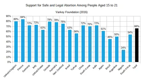 In 2016, the Varkey Foundation and Populus conducted an international study examining the attitudes of 20,000 people aged 15 to 21 in twenty countries.[note 1][60] The survey showed that 66% of people aged 15 to 21 favored legal abortion, but there was significant variation among the countries surveyed: support for this procedure was strongest in France, the United Kingdom, and Canada, but lowest in Argentina, Brazil, and Nigeria.[61] Gallup polls conducted in 2020 in the U.S. revealed that 61% of people aged 18 to 29—older members of Generation Z and younger Millennials—considered themselves pro-choice, while only 34% identified as pro-life. In general, the older someone was, the less likely that they supported access to abortion.[62] Nevertheless, anti-abortion sentiments among American youths in the early 2020s were sufficiently strong to motivate them to participate in the annual March for Life in Washington D.C.[63][64][65]