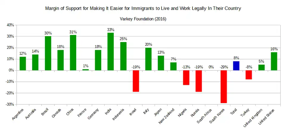 In a 2016 Varkey Foundation and Populus international survey,[note 1] the question of whether or not those 15 to 21 favored legal migration received mixed responses. Overall, 31% believed their governments should make it easier for immigrants to work and live legally in their countries while 23% said it should be more difficult, a margin of 8%.[60][61] While 72% of Brazilian youths thought their government was doing too little to address the international refugee crisis, only 16% of young Turks did; in the U.K. that number was 48%.[60]