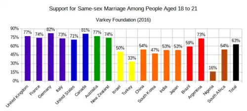 The 2016 Varkey Foundation and Populus survey also asked about people's viewpoints on moral questions regarding sex and gender. Overall, 89% supported equality between men and women, with support being the highest in Canada and China (both 94%), and the lowest in Japan (74%) and Nigeria (68%). 74% favored recognizing transgender rights, but with large national differences, from an overwhelming majority of 83% in Canada to a bare majority of 57% in Nigeria. 63% approved of same-sex marriage, but there were again huge variations among countries. 81% of young Germans and 80% of young Canadians agreed that same-sex couples should be allowed to marry, compared to only 33% of young Turks and 16% of young Nigerians who did.[60][61] In a 2018 Pew Research Center survey, 48% of Generation Z participants said that same-sex marriage was good for society.[7]