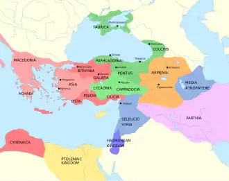 Hereafter the simple name Pontus without qualification was regularly employed to denote the half of this dual province, especially by Romans and people speaking from the Roman point of view; it is so used almost always in the New Testament.[19] The eastern half of the old kingdom was administered as a client kingdom together with Colchis. Its last king was Polemon II.