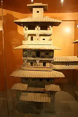 During the Warring States period (475–221 BC), the development of private commerce, new trade routes, handicraft industries, and a money economy led to the growth of new urban centers. These centers were markedly different from the older cities, which had merely served as power bases for the nobility.[6] The use of a standardized, nationwide currency during the Qin dynasty (221–206 BC) facilitated long-distance trade between cities.[7] Many Han cities grew large: the Western Han capital, Chang'an, had approximately 250,000 inhabitants, while the Eastern Han capital, Luoyang, had approximately 500,000 inhabitants.[8] The population of the Han Empire, recorded in the tax census of 156 AD, was 50.6 million people in 12,366,470 households.[9] The majority of commoners who populated the cities lived in extended urban and suburban areas outside the city walls and gatehouses.[10]
