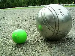The object is to throw a ball (boule) as close as possible to a smaller ball, called the cochonnet, (this kind of throw is called to faire le point or pointer); or to knock away a boules of the opponent that is close to the cochonnet (this is called to tirer). Players compete one-on-one (tête-à-tête), in teams of two (doublettes) or teams of three (triplettes). The object is to accumulate thirteen points. The point belongs to the ball the closest to the cochonnet. A player pitches balls until he can regain the point (reprenne le point) by having his ball closest to the cochonnet. Each ball from a single team, if there are no other balls from the other team closer to the cochonnet, counts as a point. The points are counted when all of the balls have been tossed by both teams.[52]