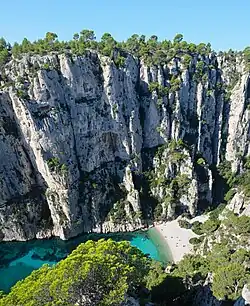 The changes in the sea level led to one of the most remarkable discoveries of signs of early man in Provence. In 1985, a diver named Henri Cosquer discovered the mouth of a submarine cave 37 metres below the surface of the Calanque de Morgiou near Marseille. The entrance led to a cave above sea level. Inside, the walls of the Cosquer Cave are decorated with drawings of bison, seals, auks, horses and outlines of human hands, dating to between 27,000 and 19,000 BC.[10]