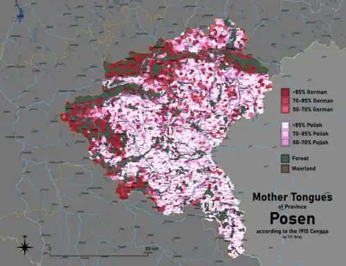 There is a notable disparity between German statistics gathered by the Prussian administration, and the Polish estimates conducted after 1918. According to the Prussian census of 1905, the number of German speakers in the Province of Posen was approximately 38.5% (which included colonists, military stationed in the area and German administration), while after 1918 the number of Germans in the Poznan Voivodship, which closely corresponded to province of Posen, was only 7%. According to Witold Jakóbczyk, the disparity between the number of ethnic Germans and the number of German speakers is because Prussian authorities placed ethnic Germans and the German-speaking Jewish minority into the same class.[24] Around 161,000 Germans in the province were officials, soldiers and their families settled in the region by German Empire.[25] In addition, there was a considerable exodus of Germans from the Second Polish Republic after the latter was established. There was also Polonization of local Catholic Germans. Another reason of the disparity is that some border areas of the province, inhabited mostly by Germans (including Piła), remained in Germany after 1918.[26][27] According to Polish authors, the real share of Poles in 1910 was 65% (rather than 61.5% claimed by official census).[21]